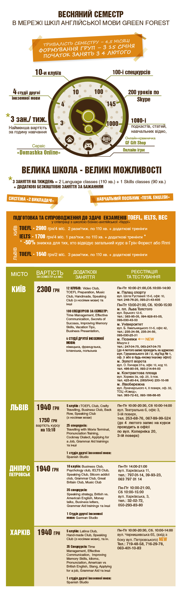 Green Forest – школа англійської мови, що працює в 4-ох регіонах: Київ, Львів, Дніпропетровськ, Львів. Зараз Грін Форест активно формує групи на новий семестр навчання англійської, який розпочинається 4-9 лютого і триватиме 4,5 міс.