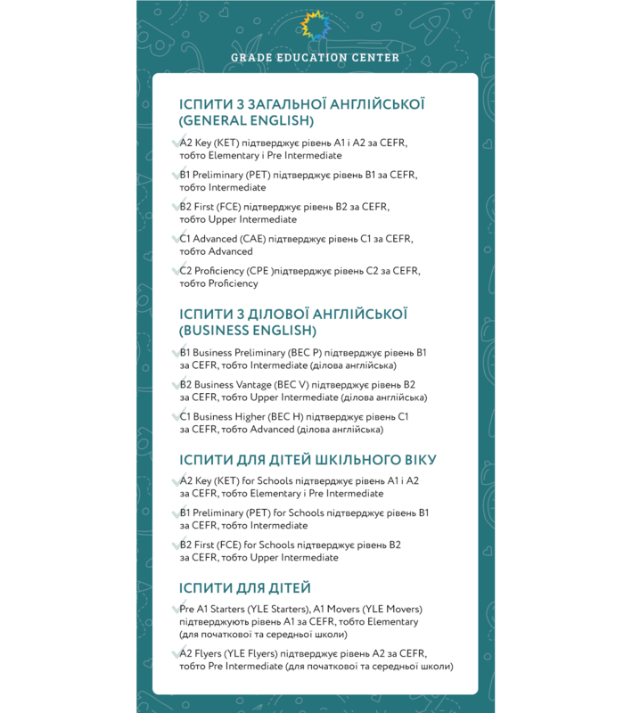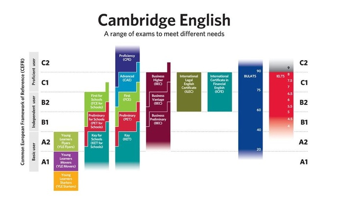 Серед найпопулярніших іспитів системи Cambridge Assessment English – KET, PET, FCE, CAE, BEC та інші. Іспити від Кембриджу підтверджують рівень володіння англійською мовою, тому складати їх потрібно передусім тим, хто впевнений у своїх навичках і бажає отримати міжнародний сертифікат, який їх засвідчить.