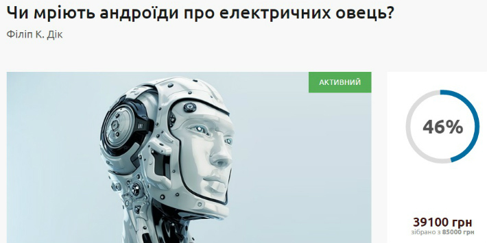 Як саме? Проект пропонує книги, підраховує витрати на видання і оголошує суму, яку потрібно зібрати для того, аби книга була перекладена та видана. Наприклад, просто зараз ви ще встигаєте долучитися до підтримки видання роману Філіпа К. Діка: