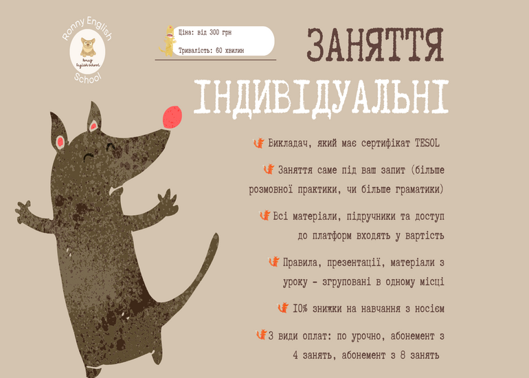 Ми онлайн школа англійської мови Ronny English School. Ми пропонуємо якісне та доступне навчання як для дітей, так і для дорослих. У нас ви знайдете групові та індивідуальні заняття, можливість відвідувати безкоштовні спікінг клаби та систематизовану роботу на онлайн-платформі. Ми дуже любимо розвиватися и робити навчання крутішим та цікавішим, тому в нас купа акцій, розіграшів та призів.