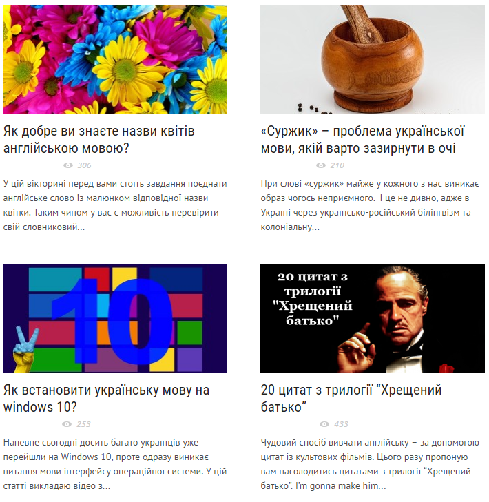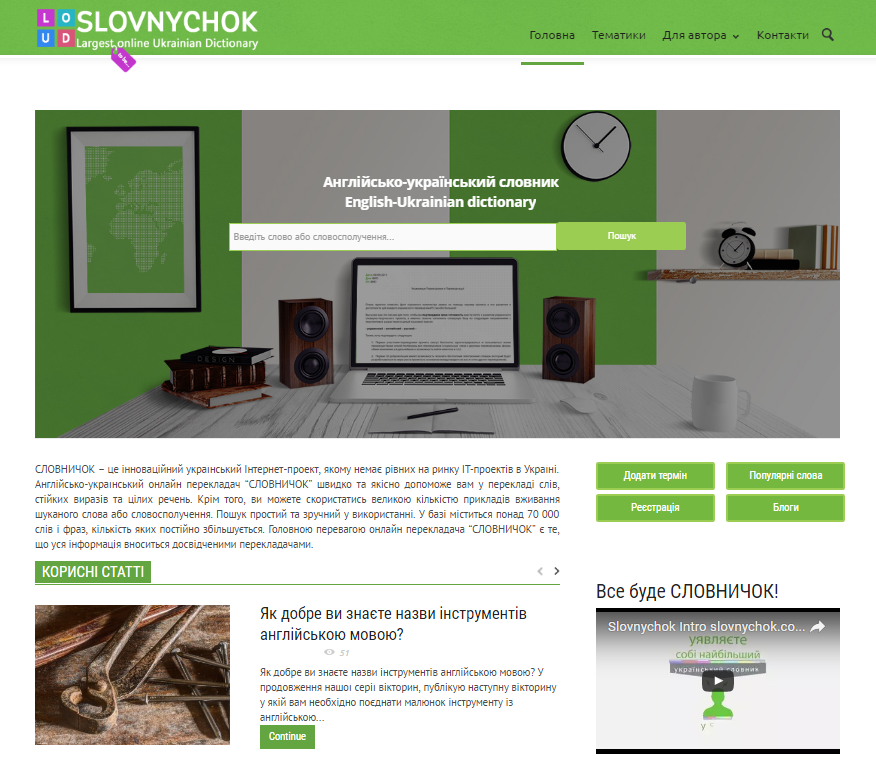 В рубрике «Полезные статьи» посетители сайта «Словничок» найдут разнообразные викторины, которые помогут проверить словарный запас, цитаты из непревзойденных фильмов с переводом на украинский, а также просто интересные статьи.